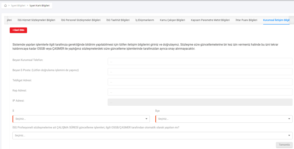 5. Açılan ekrandaki iletişim bilgileri ve otomatik onay izni alanı gerekli şekilde doldurularak TAMAMLA butonuna tıklanarak işlem tamamlanır.